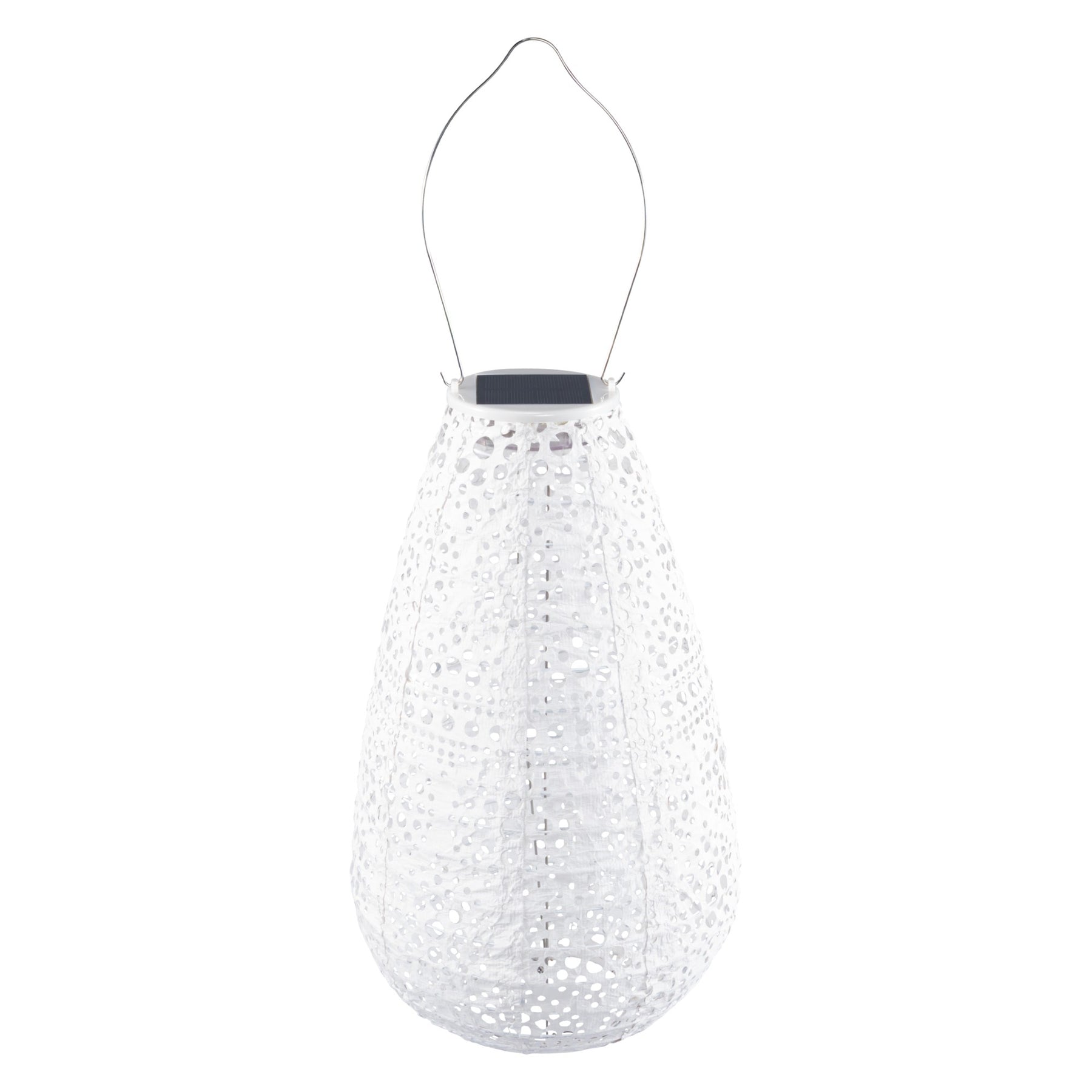 The Stella Teardrop Blossom Solar Lantern features a teardrop shape with an ornate lace-inspired punch, coming alive as the sun sets to cast intricate shadows across the evening sky. Crafted from ultra-durable Tyvek, this solar-powered lantern blends artful design with sustainable function, adding warmth and dimension to any outdoor space.